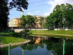 Shortly after Emperor Paul's accession to the throne in 1796, he ordered the demolition of Empress Elizabeth's Summer Palace and its replacement with the Mikhailovsky Castle, which was finally completed in 1801.[1] The garden was once more included in the new developments, which retained most of the existing ponds, while planting lines of trees around their perimeters. Four of the five original fishponds were preserved, and were connected together by underground pipes which linked them with an ornamental pond in the western part of the garden.[4] Water became an important feature in the new designs, which envisaged the Mikhailovsky Castle as a moated construction, entirely surrounded by water and crossed by drawbridges which could be raised.[1] The castle stood between four waterways: the Moyka and Fontanka Rivers, and the specially-dug Church and Voskresensky Canals.[4] After Paul's assassination in the castle in 1801, the imperial family abandoned the residence, and it and its surroundings fell into disrepair, with the castle eventually transferred to the Main Engineering School in 1822.[1][4][6]