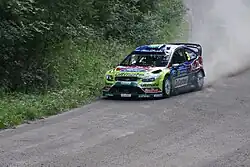 At the Rally d'Italia Sardegna, Hirvonen and Loeb both dropped time on day one in a bid to gain a better road position. After Loeb incurred a puncture, Hirvonen found himself unable to catch teammate Latvala, who had been pushing in front from start to finish.[11] In the following Acropolis Rally in Greece, Hirvonen took his first win of the season. With Loeb crashing out, he reduced the Frenchman's championship lead to seven points.[12] At the following Rally Poland, Loeb crashed again, although recovered to seventh, with Hirvonen winning his second consecutive rally he moved to the top of the standings. In Finland, Hirvonen took the lead on the first proper stage and continued pulling away from Loeb to take his debut win in his home event.[13] A few weeks later, in Australia, Mikko was again in a tight battle with Loeb, where Loeb eventually won. Unfortunately for Loeb his car was found to have rollbar irregularities, as did Dani Sordo and Sébastien Ogier. They were then given 1 minute time penalties, which handed Hirvonen the win and 10 points. Hirvonen led the 2009 Championship by a point from Sebastien Loeb, and needed a win to clinch the title, but a hard landing from a jump on the penultimate stage caused the bonnet hinge to fail, as time ticked by to get rid of the bonnet cover, the Championship was handed to Loeb.[14]