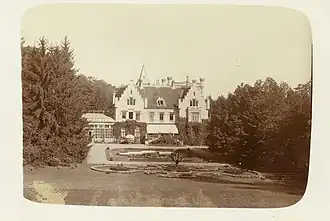 Mikosdpuszta was established by Baron Ede Mikos de Taródháza between 1857 and 1866. The former name of the area was Belső-Soreke. The mansion was built in the middle of an old oak forest, on top of a small artificial mound. It was built in English Gothic Revival style with many turrets and gables. Mikosdpuszta was a modern family home with its own electricity works, central heating and plumbing. A Gothic chapel and a palm house was added later to the main building. A picturesque landscape garden was laid out around the mansion on 284 acres (1.15 km2) with two artificial lakes, many pavilions, a vineyard and stables.