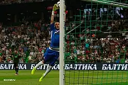 Three years after rumors of a transfer to Red Star Belgrade,[35] Borjan made the transfer official, replacing Filip Manojlović on 24 July 2017. Borjan signed a three-year contract with the club and chose the jersey number 82.[36] He made his debut in the first leg of the third qualifying round for the 2017–18 UEFA Europa League, keeping a clean sheet in a home victory against Sparta Prague on 27 July 2017.[37] He played his first eternal derby with the club a month later.[38]