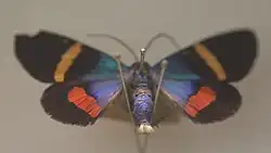 This species appears to be a black butterfly like moth with two orange lines on the upper wings and two red rectangular features on the bottom two wings. The pattern merges to blue as you go towards the abdomen which is also neon blue. It has yellow bristles at the end of its abdomen.[2][1]