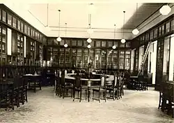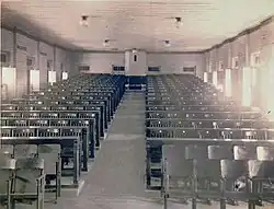 Major reforms in 1919–1920 put an end to the original precariousness. The building was expanded, taking on the shape of a long rectangle with three courtyards, divided by pavilions. The façade was renovated in an art nouveau style and the first courtyard received a second floor. In the early 1930s, it was used for classrooms, administrative offices and, in the background, the library and cinema; the second courtyard had living quarters, and the third, living quarters on one side, the ranch and casino[c] on the other, and the infirmary pavilion at the rear.[95][96] Despite the expansions, the facilities remained sober and modest and comfort was not a priority.[97] A decade later, the dormitories, infirmary, kitchen and dining halls were already degraded, there were no specific places for leisure and prison, there was little water and physical activities were carried out in soggy land.[98]