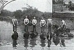 José Machado Lopes, a student in 1918, recalled an anarchic environment in the early years: the School was "an educational institution in which a family could not enter. The student's ideal was to be macho, with a gun on his waist and a machete in his vest." "Students would walk around naked and leave school that way to go buy a newspaper at the Station." "When the students passed through Bangu, people locked the doors, otherwise the students would invade everything."[162] João Punaro Bley, recalling the same year, described the young people as “practically given over to their own impulses”.[163] This changed in 1919–1922, when commander Monteiro de Barros and the instructors at the Indigenous Mission imposed a strict discipline, which students recalled as excessive. Prisons became the most common punishment, and the rate of punishments increased a lot. The verb “to toast” was synonymous with “to punish” at the time.[161][164]