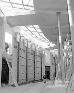 In March 1992, the Memorial announced it was ready to offer its design to the CFA, NCPC, and other approval agencies. The new design modified the Hemicycle by restoring a low water feature to the central niche and removing the grass circle, replacing it with a circular reflecting pool and paved plaza. The center of the plaza was slightly lowered, and very low terraces led from the edge of the pool to the edge of the plaza. Four niches were still pierced to create stairs leading up to the terrace, but now an elevator was added as well to make the memorial handicap-accessible. The tall illuminated pylons were removed, and in their place were 108 horizontal thick glass panels forming an arc in the back of the Hemicycle's terrace. These panels formed the skylight for the memorial below, and Weiss and Manfredi said they would contain quotations from women who served in the military. A thin stream of water was intended to flow over the panels, as if "carrying" women's voices to the water feature and reflecting pool.[93][94] Trees still framed the reflecting pool, but underground, behind the Hemicycle, the architects added a curved gallery and placed the rooms — the 250-seat auditorium, the computer room, the exhibition hall, the offices — in sequence.[49] The redesign won high praise from The Washington Post architecture critic Benjamin Forgey. He called it "a significant addition" to the city's memorials, and said it was "a perfect gesture in a proper place at a fitting moment". He also found the design sensitive, consistent, and poetic. The revisions, he said, had not harmed the memorial as they had so many other structures in the city. "...[S]omething definitely was gained. ... The second design is safer than the first, in some particulars more unified, and, in all respects save one, as evocative."[49]