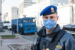 Gendarmerie personnel serving with the European Gendarmerie Force (EUROGENDFOR) – an EU crisis response and intervention force – wear the standard EUROGENDFOR royal blue beret and badge when so assigned.