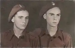 During the Second World War, the use of the black beret was extended to all the regiments of the Royal Armoured Corps in 1940. The maroon beret was adopted by British airborne forces in 1941 (the Special Air Service had adopted a sand coloured beret, was subsequently compelled to change to maroon in common with other airborne units, but resumed wear of the sand beret after the Second World War) and the green beret by the Commandos in late 1942. A khaki beret was worn by the Reconnaissance Corps from 1941 until 1944,[60] and the Royal Air Force Regiment adopted a blue-grey beret in 1943.[61] Later in the war, a rather baggier beret-like hat, called the General Service Cap, was issued to all ranks of the British Army (with RAC, parachute, commando, Scottish and Irish units excepted), to replace the earlier Field Service Cap.[62] The GS Cap was not popular, and after the war was replaced with a true beret.[63][64]