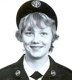 Starting in the 1970s, a special female beret was authorized for wear as alternate headgear for the Army, Air Force, Navy, and Marine Corps with various service uniforms.[84][85][86][87] The Navy was the last service to remove the female beret from their uniform regulations in 2015.[88] These black (Army and Navy), dark-blue (Air Force), and dark-green (Marine Corps) female berets were of similar design and worn on the crown of the head.[84][85][86][87][89] These service members wore their traditional cap devices on these female berets but unlike today's Army and Air Force beret flashes, these devices were worn center-forward on the beret with the exception being the Navy who wore their devices centered over the left eye.[84][85][86][87][89]