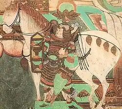 Close up view of the Ming dynasty painting "Departure Herald" showing riders wearing lamellar and mountain pattern armour -