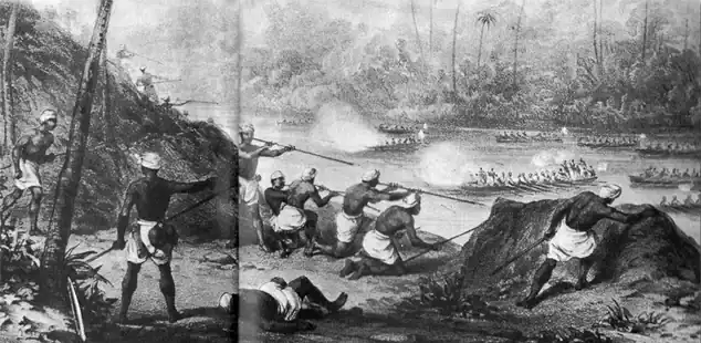 The Pendekar (English: Warrior) were usually the ones who fought outside of the Sultanate, due to them being easier to mobilise for wars. They were commanded by local chiefs who later on, became semi-autonomous.[34] They were armed with traditional weapons like bows and arrows,[35] Keris, spears and others. The first ever "firearm" in Brunei were hand cannons probably Huochong hand cannons were used during the reign of Sultan Bolkiah,[5] Istinggars bought from Jambi Sultanate which was imported to Brunei during the Bruneian Civil War.[14] They later began to acquire flintlock muskets like pemuras and terakol in the late 17th century and early 18th century[32][36] from most likely from European merchants and regional powers in Asia. Which they used during the War on piracy, the Twenty Years' War, the Bruneian Civil War of 1826, the Sarawak Uprising of 1836 and the Anglo-Bruneian War. Many high ranks were also armed with talwar or barong.[23] Like Datu Patinggi Ali and Embo Ali.
