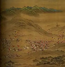 Princes of the Imperial family were also granted substantial military authority in strategic points around the empire. Each was granted an estate with the power to recruit military officers for their personal staff (this was restricted in 1395) and held total judicial authority over them. This ancient system, intended to provide military experience before deployment, had not been used in China for a thousand years.[42] Princes were also dispatched to join campaigns with their personal bodyguards. Zhu Di, Prince of Yan, impressed the Hongwu Emperor with his command of the 1390 campaign against the Mongols under Nayir Bukha and was allowed to retain command of the 10,000 Mongol soldiers he had captured. This later aided the prince in his usurpation of the throne. In some cases the princes were appointed to fill vacant command positions. Zhu Gang, the Prince of Qin, was sent to build military colonies (tuntian) beyond the Great Wall.[43] Princes were granted an escort guard (huwei bing) under their personal control, while a court-appointed officer commanded the shouzhen bing or garrison force, over which the princes only had authority during emergencies declared by the Emperor. This dual chain of command was meant to prevent a coup d'état in the capital. The garrison force could only be deployed with an order carrying both the Emperor's and the Prince's seal. The Regional Military Commission armies were then used to check the princes' military power. Many princes amassed large bodyguard forces and transferred regular soldiers to their personal command without authorisation anyway, using them on campaign.[44] The authority of princes was curtailed by the Jianwen Emperor. When the Yongle Emperor came to power, he further purged his brothers on trumped up charges and abolished most of the princely guards; by the dynasty's end there were less than a dozen extant. He also established a hereditary military nobility from his top generals during his usurpation, both Han Chinese and Mongol. They were however denied long-term commands so as to prevent personal power bases from forming.[45]