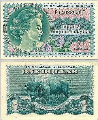 Military payment certificates, or MPC, was a form of currency used to pay United States (US) military personnel in certain foreign countries in the mid and late twentieth century. They were used in one area or another from a few months after the end of World War II until a few months after the end of U.S. participation in the Vietnam War – from 1946 until 1973. The certificates were made by line lithography to create colorful banknotes that could be produced cheaply.