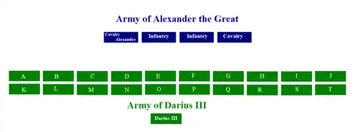 Alexander the Great had an army of 47,000 men, which was small compared to those of Darius—who according to modern historians assembled between 50,000 and 120,000 soldiers, maximum figure due to supply problems. The "hammer" and "anvil" tactics, which were the key to Alexander's victories until then, could no longer lead to victory, for it was indeed impossible to surround the entire Persian army.