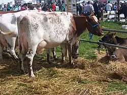 The Dairy Shorthorn is a British breed of dairy cattle.[5]: 132 [6]: 59 It derives from the Shorthorn cattle of Teesside, in the North Riding of Yorkshire and in Northumbria (now divided between County Durham and Northumberland) in north-eastern England.[7] The Shorthorn was for this reason at first known as the Durham or Teeswater.[7]