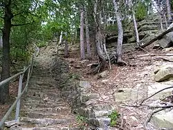 A 0.4-mile (640 m) nature trail circles the base of Mill Bluff. 223 stone steps built by the Works Progress Administration in the 1930s lead to its top. 0.8 miles (1.3 km) north on County Road W (Funnel Road) is a pullout for the 1.25-mile (2.0 km) Camels Bluff loop trail, which passes between the two sections of Camels Bluff and leads past the base of Devils Monument and Cleopatra's Needle.
