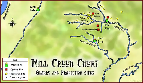At the turn of the 20th century, archaeologists began realizing that in the hilly lands of Southern Illinois was the location for the quarrying and production centers—one of the greatest in prehistoric North America for this type of stone.[2] The sites were located near Mill Creek, Illinois, a village in Union County, located between Jonesboro and Cairo on the Alexander County line.[3] From this collection of sites, known colloquially as the "Indian Diggings", Native Americans quarried, worked into tools and blanks, and exported this stone to the wider Mississippian world. The chert found here was one of the major exported raw materials of the Mississippian culture and its distribution and procurement was one of the largest mining and production efforts organized during the Mississippian period.[2] The raw material was dug up in the quarries and then transported to small hamlets for production in hoes, spades and blanks. Archaeologists believe they were then transported to and traded at regional mound centers such as the Hale Site, a palisaded village with a platform mound and a burial mound. From these local sites, they were then transported and traded at sites even further afield. These materials were some of the most widely exchanged items during this period,[2] with especially large amounts transported to the American Bottom region. Examples are numerous at Cahokia, where it was especially prized for hoes and spades,[1] but finds have been made in locations as distant as Spiro and Moundville.