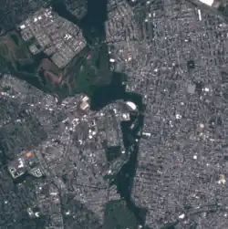 Sentinel-2 true-color image of Millbourne (center), West Philadelphia (right), and Upper Darby (left), June 2022[36]