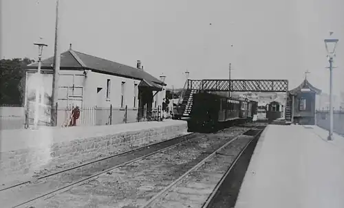 Millbrook station opened in 1870 when the railway first began operations. The standard gauge line was relaid to narrow gauge in 1884. In 1912 the station site was slightly relocated owing to a road widening scheme,[1] and the new facility was built with two platforms, each having buildings, and connected by a footbridge. The track plan included a passing loop and a short siding. The station remained operational throughout the life of the Jersey Railway, and was closed when the line ceased operations in 1936.