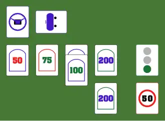 Each player (or team) builds a tableau to display the cards played to the other player(s) or team. In the four-player, two-team game, two players are responsible for a single tableau.[5]: 2 The example shows a single typical tableau midway through a hand. The tableau is divided into battle, speed, distance, and safety areas; cards in the battle and speed areas are stacked so that only the top card shows.[5]: 6, 8–9 [8]: 4–5