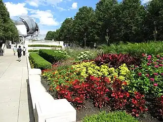 The park was conceived as a 16-acre (6.5 ha) landscape-covered bridge over an underground parking structure to be built on top of the Metra/Illinois Central Railroad tracks in Grant Park.[15] The parks overall design was by Skidmore, Owings & Merrill, and gradually additional architects and artists such as Frank Gehry and Thomas Beeby were incorporated into the plan.[14] Sponsors were sought by invitation only.[16]