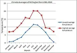 The graph on the left shows the average high temperatures and low temperatures from 1981 to 2010.[23] These averages can be compared to the United Kingdom as a whole. It is evident that Millington's maximum temperatures are higher than those of the UK, for example, across the summer months of June, July and August there is a 1–2.5 degrees Celsius difference between the two sets of data. The winter months of November, December and January, Millington is cooler than the average temperature of the United Kingdom, for example the minimum temperature is 1.1 degrees Celsius compared to Millington's 0.6.[24]