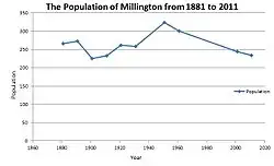 According to the 2011 Census it had a population of 234;[13] in 2001 the population had been 244.[14] The first Census to be noted in 1881, 130 years earlier, recorded the population of Millington to be 266 people. This is a similar figure to that taken from the last Census data. In 1901, there was a decrease to 225, which remains low in the Census 10 years later.[15] It is evident that from 1921 onward that there was a steady increase in population, reaching its peak in 1951 with a total of 324 people. This could be due to the post-World War II Baby Boom from 1943 until 1960.