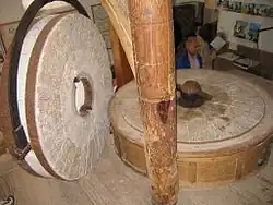 It stands out from the grain mill thanks to the truncated cone shape and greater height of its runner millstone (agurf wuflla), as well as the presence of a spout (abajjr or tilst) and a pouring spout (ils) on the nether millstone (agurf u wadday). At the center of the nether millstone is a short pivot (tamnrut) made of argan wood, around which the upper millstone rotates, pierced by an eyelet (tit n tzrgt) into which one or two handfuls of kernels are inserted. The circular movement is interrupted to remove the kernels after the millstone has been lifted. The whole unit can be raised on stones welded together in a "bakehouse"-style architecture, allowing embers or argan shells to warm the unit, thus facilitating grinding in winter.[14]