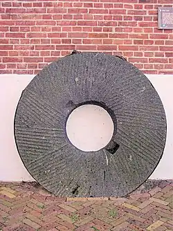 In a study of millstones in Flanders from the Middle Ages to the French Revolution, Jean Bruggeman[35] points out that medieval millstones were always monolithic, that black basalt stones were still monolithic in later centuries, and that white stones remained so until the 18th century. However, "gisantes" were sometimes made up of several irregularly shaped pieces. These were bound in plaster, encased in an iron or wooden casing, and sometimes placed on a bed of cemented bricks.