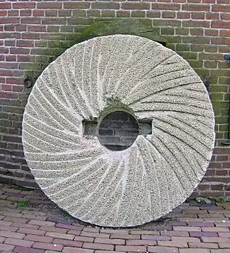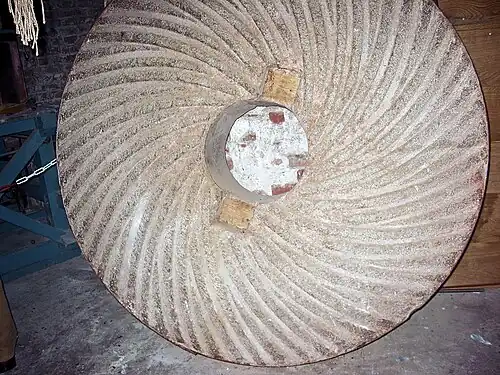 An example of this type of millstone can be found as early as the Classical era, used to grind ore in the Laurion mines,[27] although it did not overtake the less efficient reciprocating millstone.[28] Despite its qualities, it didn't really spread throughout the Roman world until later.[27] They were found throughout the Mediterranean basin, but never in very large numbers, except in Italy. Their very high cost - 1,250 denarii in the Late Roman period, compared with 250 denarii for hand millstones - meant that they were only used by millers and bakers. In Gaul, millstones are known from Lyon, Saint-Raphaël, Paris, Amiens and Clermont-Ferrand, all fashioned from basalt from the Eifel, Volvic or Cap d'Agde.[22]