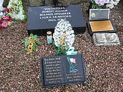 The cemetery has, for some, become synonymous with Irish republicanism. Irish Republican Army prisoner Bobby Sands, who died on hunger strike on 5 May 1981, is buried in the cemetery. Fellow hunger-strikers Kieran Doherty, Joe McDonnell and Pat McGeown (who died of a heart attack in 1996) are also buried there. In total, 77 IRA volunteers are buried in what is known as the 'New Republican Plot', and a further 34 volunteers are buried in what is known as the County Antrim Memorial Plot, which was used between 1969 and 1972.[5] Throughout the cemetery, many more IRA volunteers are buried in family graves. These include Tom Williams, who was executed in Crumlin Road Prison on 2 September 1942. Williams' body lay in a prison grave until January 2000, when a campaign by the National Graves Association, Belfast to have his remains re-interred in Milltown was successful.[6] Members of the INLA, IPLO and Workers' Party are also buried there.[3]