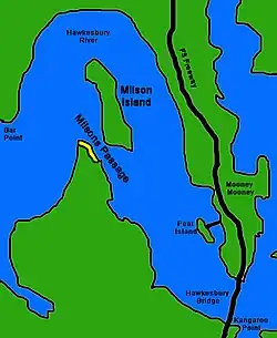 Milson Island is an island located in Sydney, New South Wales, Australia. It was first settled over 100 years ago and has been used as a bacteriological station, quarantine station, a hospital to treat soldiers from WWI with venereal disease, mental hospital, a rehab for alcoholics, a women's jail, and now a sports and recreation centre.[1]