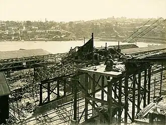 The second Lavender Bay Station was a redesign of the first station, and came into use on 27 April 1924. This station was necessary because a contract had been let for the construction of the Sydney Harbour Bridge and the Milsons Point land was required for workshops associated with the construction. The second Lavender Bay station was a terminus as the lines to Milsons Point were actually removed. Thus it was a more passenger-friendly version of its predecessor. The electric tram terminus was also moved to Glen Street on the cliff above the station.[2] Lifts and escalators, the first in Australia,[3] were installed.