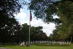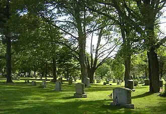 Milton Cemetery is a historic cemetery at 211 Centre Street in Milton, Massachusetts. Established in 1672, it is the town's only municipal burying ground. There are three distinct sections to its 102-acre (41 ha) grounds: the original burying ground, a tract of 3 acres (1.2 ha) which was in use between 1672 and 1854, a "new" section, laid out in 1854 in the rural cemetery style which was fashionable in the 19th century, and a "modern" section, established in 1945.[2]
