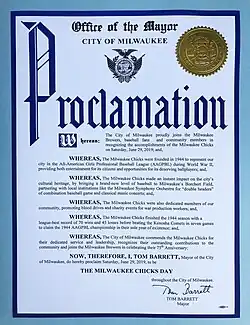 The Brewers celebrated the Chicks' 75th Anniversary in 2019 with a special theme night, including a reproduction 1944 baseball cap giveaway.[8] Mayor Tom Barrett declared the same day, June 29, 2019 as "The Milwaukee Chicks Day" throughout the city of Milwaukee.[9]