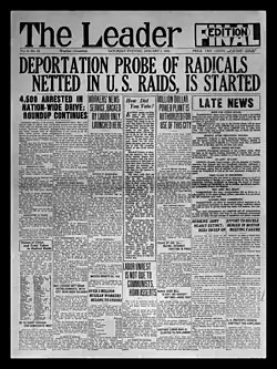 During World War I, the paper's consistent antimilitarist stand brought it into conflict with the administration of President Woodrow Wilson and his Postmaster General Albert Burleson. The Leader's second class mailing privileges were withdrawn in October 1917 and the publication was banned from the United States mails, eliminating about 14,000 subscribers with one blow.[3] In August 1918 the publication was deprived of the right to receive first class mail, with all letters from subscribers and readers sent to the publication summarily returned to sender with the envelope stamped "Mail to This Address Undeliverable Under Espionage Act."[4] The paper was twice raided by the U.S. Department of Justice and subscriber records were seized.[5]
