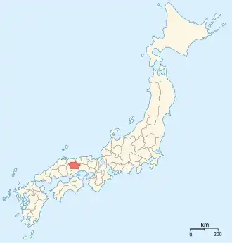 Mimasaka Province (美作国, Mimasaka no Kuni; Japanese pronunciation: [mʲi.maꜜ.sa.ka (no kɯ.ɲi)][1]) was a province of Japan in the area that is northern Okayama Prefecture in the Chūgoku region of western Japan.[2][3] Mimasaka bordered Bitchū, Bizen, Harima, Hōki, and Inaba Provinces. Its abbreviated form name was Sakushū (作州). In terms of the Gokishichidō system, Mimasaka was one of the provinces of the San'yō circuit.