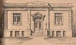 It began as Mimico Carnegie Library after the Village of Mimico held a plebiscite in 1913 to request funds for a Carnegie Library,[2] several already having been built in Toronto. Mimico's population was below the threshold set for Carnegie grants but was nevertheless approved and in 1915 the Mimico Carnegie Library opened on Pigeon St (later combined with Stanley Ave.). In 1917 Mimico became a Town and the town council used the library for its meetings until it purchased the old Mimico Wesleyan Methodist Church on Church St (Royal York Rd) which was vacated by the Methodist Church after the construction of the new United Church.[3]
