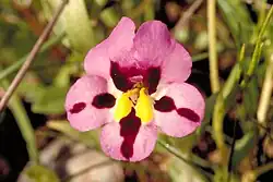 Diplacus tricolor is an annual herb growing up to about 14 centimeters in maximum height. The oppositely arranged, lightly hairy leaves are widely lance-shaped and up to about 4.5 centimeters long. The flower corolla may be up to 5 centimeters long, its narrow tubular base emerging from an uneven calyx of sepals. The wide mouth of the flower is deep pink in color with a white and yellow blotched throat and a large maroon spot at the base of each of the five lobes.