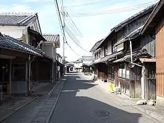 Minakuchi-juku developed as early as the Muromachi period, as its location was convenient for travelers going to the Ise Grand Shrine and Ise Bay. In the early Edo period, the system of post stations on the Tōkaidō was formalized by the Tokugawa shogunate in 1601, Minakuchi-juku became an official post station. It was on the sankin-kōtai route by many western daimyō to-and-from the Shogun's court in Edo. Minakuchi Castle was constructed in 1634 on the western border of the town by Shogun Tokugawa Iemitsu as a way station where he could stay at during his travels between Edo and Kyoto.[1] It was built in a similar fashion to Nijō Castle.[2] Minakuchi was thus both a post station and a castle town, In 1682, Minakuchi Domain was created with a cadet branch of the Katō clan ruling until the Meiji restoration.