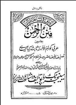Arabic - the Mother of all Languages - (Book) Minan-ur-Rahman [Arabic: منن الرّحمٰن ] is a brief treatise on philology by Mirza Ghulam Ahmad (1835-1908), written in May 1895. Ahmad claimed that Arabic was the first language taught to man by God Himself and the Mother of all languages (Arabic: Ummul-al-Sinnah). He highlighted certain peculiarities of the Arabic language, which he claimed could not be found in any other language and challenged his adversaries, to refute his claim also addressing Max Muller (1823-1900) to come forward and meet the challenge.