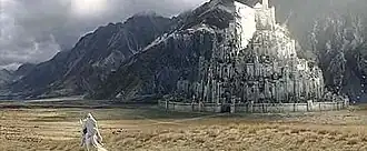 Christopher Tuthill, in A Companion to J. R. R. Tolkien, evaluates the paintings of Minas Tirith made by the major Tolkien illustrators Alan Lee, John Howe (both of whom worked as concept designers for Peter Jackson's film trilogy), Jef Murray, and Ted Nasmith. Tuthill writes that it has become "hard to imagine" Middle-earth "without the many sub-creators who have worked within it", noting that the "dreaded effects" of what Tolkien called "silliness and morbidity" of much fantasy art in his time "are nowhere in evidence" in these artists' work.[23] In Tuthill's view, the most "fully rendered and realistic-looking" painting is Nasmith's Gandalf Rides to Minas Tirith, with a "wholly convincing city" in the background, majestic as the Wizard gallops towards it in the dawn light. He notes that Nasmith uses his architectural rendering skill to provide a detailed view of the whole city.[23] He quotes Nasmith as writing that he studied what Tolkien said, such as likening Gondor to the culture of ancient Egypt. Tuthill compares Howe's and Murray's versions of the same scene; Howe shows only a corner of the city, but vividly captures the movement of the horse and the rider's flying robes, with a strong interplay of light and dark, the white horse against the dusky rocks. Murray similarly uses strong contrast, with the white city against dark clouds overhead, but using "flat bold lines and a deep blue hue", while Howe's city more closely resembles a traditional castle of fairytales with pennants on every pinnacle, in Fauvist style. Lee chooses instead to look within Minas Tirith, showing "the same glimmering spires and white stone", a guard standing in the foreground in place of Gandalf and his horse; his painting gives a feeling of "how massive the city is", with close attention to the late Romanesque or early Gothic architectural detail and perspective.[23]