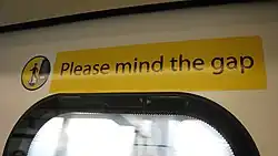 On Singapore's MRT, the phrases "Please mind the platform gap" and "Please mind the gap" are used in announcements in English, played in the trains whenever a train approaches an underground station after the station's name has been announced twice. It is played on underground station platforms just after the train doors open or, sometimes, just as the train approaches the platform. Trains also have stickers pasted on the windows to caution passengers. The Chinese version "请小心空隙" is also commonly heard.[9]