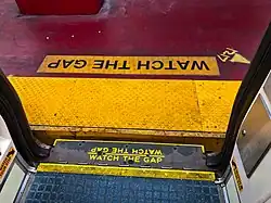 It is also used on the MTA-operated New York City Subway and the Staten Island Railway – on trains and platforms and in conductor announcements. Newer trains equipped with automated announcements would say, "As you exit, please be careful of the gap between the platform and the train", where applicable after a station announcement is made.[12][13]
