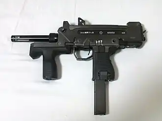 The PM-9[3] is produced by the Nippon Miniature Bearing Company, otherwise known as Minebea. The design is analogous to the Mini-Uzi submachine gun.[6] It was adopted in 1999 for non-frontline forces such as vehicle drivers, artillery personnel, some of its special forces units,[7] and some commissioned officers who were given priority for better equipment.[8] It replaced M3 submachine guns provided by the US to the JGSDF.[7] However, there is not a lot of production due to high procurement costs.[9]