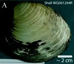 ![]() Left valve of the shell, taken in 2006. The clam was 507 years old when captured. | |