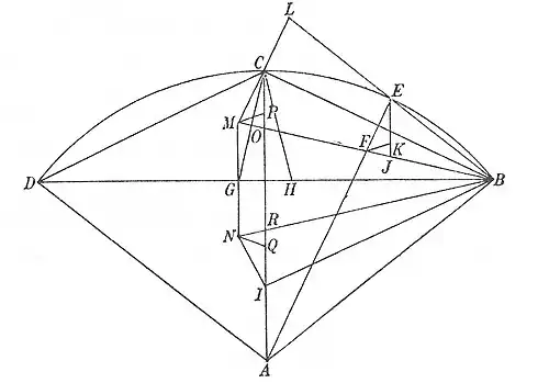 BM bisects CG and let BM = BC; join GM, CM; draw CO = CM to intercept BM at O; make MP = MO; make NQ = NR, R is the intersection of BN and AC. ∠EBC = 1/2 ∠CAE = 1/2 ∠EAB; ∠EBM = ∠EAB; thus we obtain a series of similar triangles: ABE, BEF, FJK, BLM, CMO, MOP, CGH and triangle CMO = triangle EFJ;[3]