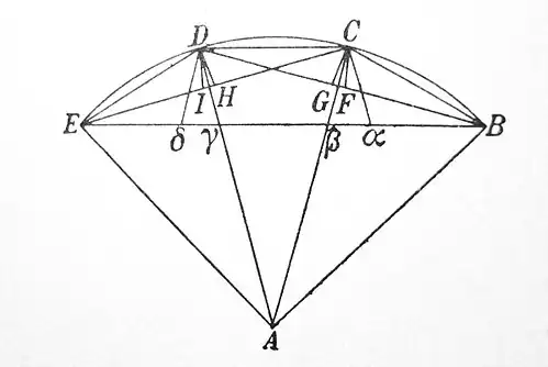 As shown in Fig 3, BE is a whole arc chord, BC = CE = DE = an are three arcs of equal portions. Radii AB = AC = AD = AE = 1. Draw lines BC, CD, DE, BD, EC; let BG=EH = BC, Bδ = Eα = BD, then triangle Cαβ = Dδγ; while triangle Cαβ is similar to triangle BδD.