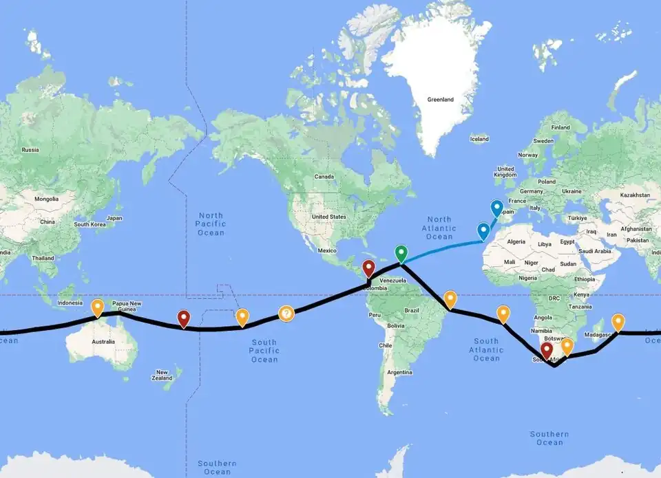 Leg 4: Cape Town to St. Helena (1900 nm), to Cape Verde (2400 nm), to Portugal (1600 nm). (5900 miles)