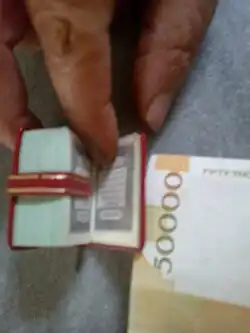 Thumbnail Quran (Arabic: مُصْحَفٌ مُصَغَّرٌ; Persian: قرآن بندانگشتی) or Miniature Quran are tiny-written Qurans having 2 types: Modern and Antique. Newer versions are produced in China, United Arab Emirates and Iran. But the antique versions can have almost 2 cm length, 1.5 cm width and 1 cm thickness. Some of them in hexagon or octagon shapes and with a metal box and a gilded leather wrapper.[1] Very antique versions have fragile papers may be foxed in contact with air. Many versions date back to the Ottoman Empire era in Turkey, in Egypt dating back possibly to the Khedivate of Egypt, and production of them in England during WWI.[2] Some are also written in different translations, such as Persian.