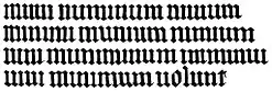 Minims often have a connecting stroke which makes it clear that they form an m, n, etc.; however, in Gothic scripts, also known as textualis especially in late examples, minims may connect to each other with only a hairline stroke, making it difficult for modern readers to tell what letter is meant. A 13th-century example of this (also possibly double as a tongue-twister) is: mimi numinum niuium minimi munium nimium uini muniminum imminui uiui minimum uolunt ("the smallest mimes of the gods of snow do not wish at all in their life that the great duty of the defences of the wine be diminished").[1] In Gothic script this would look almost like a series of single strokes (this problem eventually led to a dotted ⟨i⟩ and separate letters ⟨j⟩ and ⟨v⟩).[2]