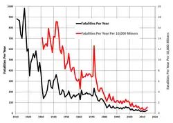 From 1880 to 1910, mine accidents claimed thousands of fatalities, with more than 3,000 in 1907 alone.[27] Where annual mining deaths had numbered more than 1,000 a year during the early part of the 20th century, they decreased to an average of about 500 during the late 1950s, and to 93 during the 1990s.[28] In addition to deaths, many thousands more are injured (an average of 21,351 injuries per year between 1991 and 1999), but overall there has been a downward trend of deaths and injuries.